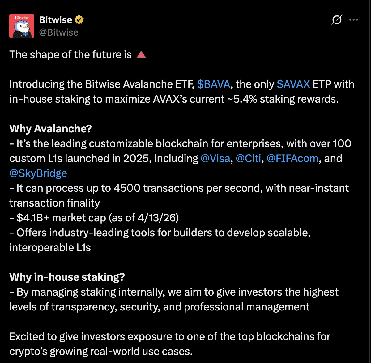 Bitwise Asset Management vừa thông báo ra mắt quỹ ETF liên kết với Avalanche mang tên BAVA. Quỹ này cung cấp cho các nhà đầu tư khả năng tiếp xúc trực tiếp với $AVAX , đồng thời tích hợp cơ chế staking vào cấu trúc của quỹ. Bằng cách staking một phần tài sản nắm giữ thông qua một đơn vị nội bộ, công ty đặt mục tiêu đạt lợi suất trung bình khoảng 5,4% trong khi vẫn duy trì tính thanh khoản. Việc ra mắt này làm nổi bật vai trò của Avalanche như một blockchain tập trung vào doanh nghiệp, hỗ trợ các hoạt động token hóa và các dự án thử nghiệm của chính phủ thông qua mức phí thấp và khả năng thanh toán gần như tức thì.