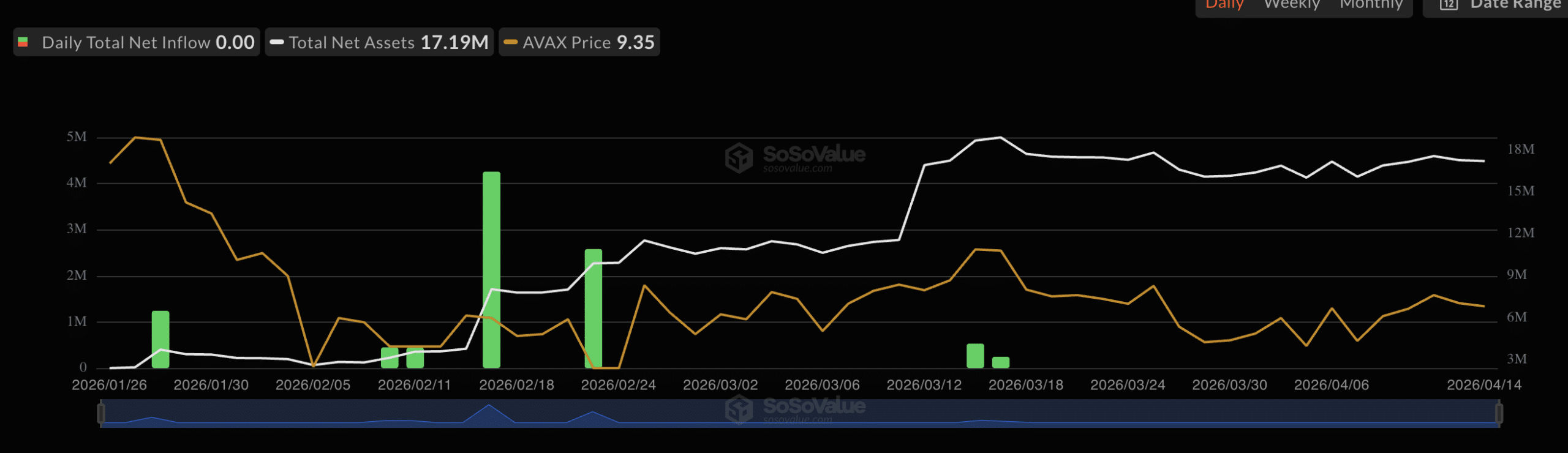 🔹 Bất chấp bước tiến này, các quỹ $AVAX ETF Spot tại Mỹ đã ghi nhận dòng tiền ròng bằng 0 kể từ ngày 17 tháng 3. Tổng tài sản ròng vẫn duy trì tương đối ổn định ở mức khoảng 17,19 triệu USD, nhưng động lượng được thấy vào đầu quý khi dòng tiền vào hàng ngày đạt đỉnh trên 4 triệu USD vào giữa tháng 2 đã hoàn toàn biến mất.