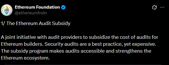 🔸 Ethereum Foundation đã triển khai chương trình "Trợ cấp kiểm toán Ethereum", một sáng kiến trị giá 1 triệu USD được thiết kế để cải thiện bảo mật cho các ứng dụng trên mainnet. Phối hợp với hơn 20 nhà cung cấp bảo mật, bao gồm Nethermind, Areta và Chainlink Labs, chương trình nhằm mục đích thu hẹp các lỗ hổng bảo mật dựa trên các nguyên tắc CROPS (chống kiểm duyệt, mã nguồn mở, quyền riêng tư và bảo mật) cho các dự án ở mọi quy mô.