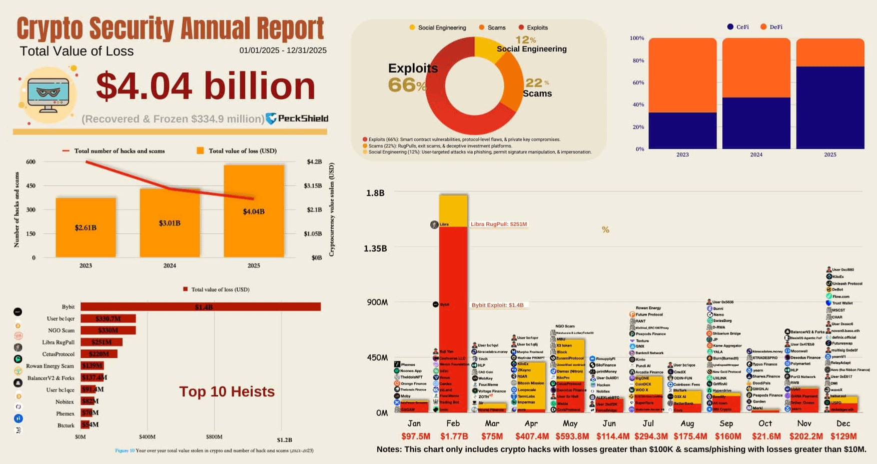 Crypto tiếp tục đối mặt với những thách thức an ninh nghiêm trọng, với mức thiệt hại vượt 4 tỷ USD vào năm 2025 và các mối đe dọa đang gia tăng trong năm 2026. Để đối phó, các mạng lưới lớn và các cơ quan chính phủ đang triển khai các biện pháp bảo mật quyết liệt nhằm bảo vệ các hệ sinh thái phi tập trung.