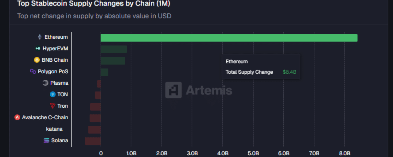 $ETH đã hấp thụ 8,4 tỷ USD nguồn cung stablecoin ròng, đưa tổng lượng nắm giữ lên gần 180 tỷ USD. Điều này củng cố vai trò của nó như một cơ sở thanh khoản chính, nơi dòng vốn ưu tiên độ sâu và bảo mật để lưu trữ. Tuy nhiên, hoạt động của stablecoin đang ngày càng mở rộng sang các mạng lưới khác.