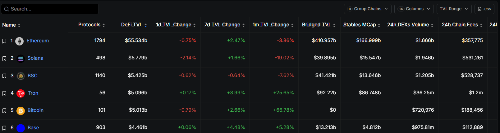 🔸 Trong khi Ethereum dẫn đầu với 55,5 tỷ USD TVL DeFi, neo giữ thanh khoản của các tổ chức, các mạng lưới như $SOL (5,77 tỷ USD TVL) và $BNB (5,42 tỷ USD TVL) hỗ trợ môi trường giao dịch năng động hơn với khối lượng DEX hàng ngày lần lượt là 1,94 tỷ USD và 1,20 tỷ USD. TRON đóng góp thêm một lớp với 86,7 tỷ USD stablecoin, kết nối cả các trường hợp sử dụng lưu trữ và chuyển giao.