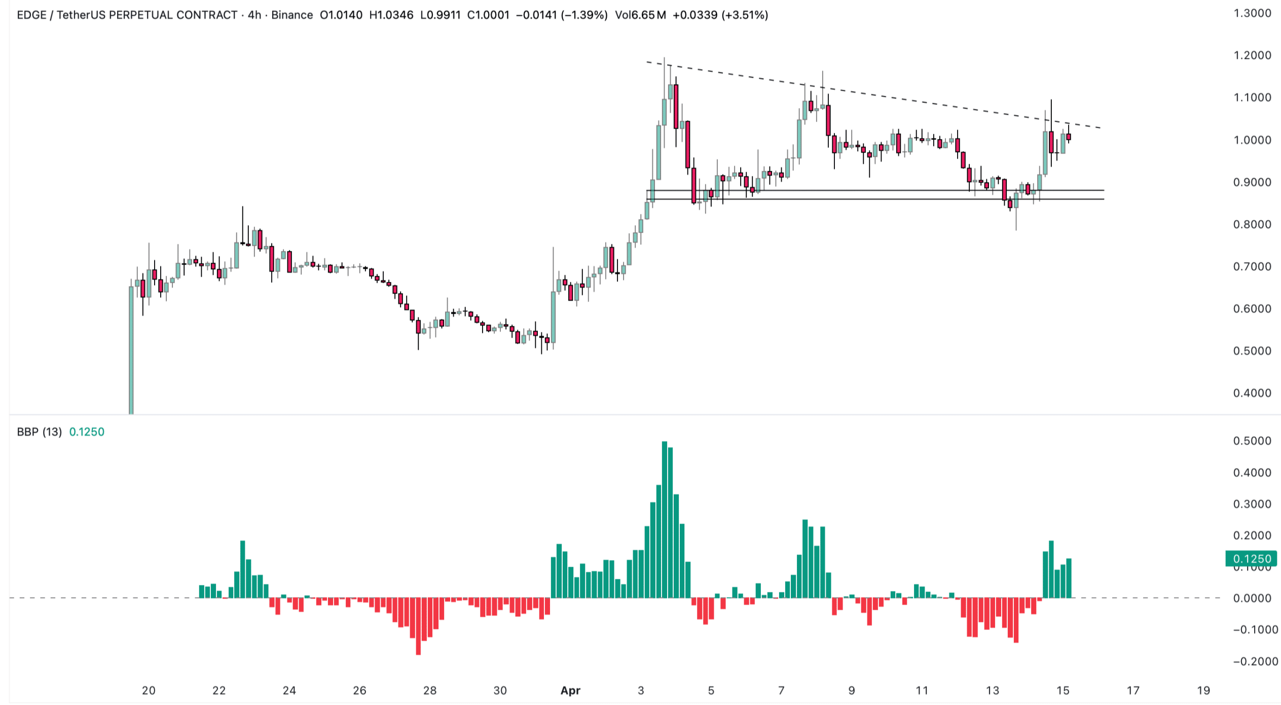 🔸 $EDGE hiện đang giao dịch trong mô hình cờ tăng giá. Chỉ báo Bull Bear Power đã in ba thanh biểu đồ màu xanh cao dần liên tiếp, cho thấy áp lực mua được duy trì. Một sự bứt phá được xác nhận trên ranh giới trên có thể nhắm mục tiêu đến mức đỉnh cục bộ 1,19 USD được ghi nhận vào ngày 3 tháng 4.