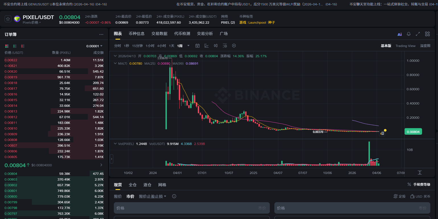 先看行情。最近这半个月,Pixels走得那叫一个磨人。日线级别均线空头排列,200日线像一堵墙从三月初就开始往下压。4月1日那一波最伤人——从0.00807附近直接被砸到0.00709,刚冒头的多头火苗一巴掌拍灭。那时候群里一片哀嚎,有人说“归零了归零了”,有人说“项目方跑路了”。