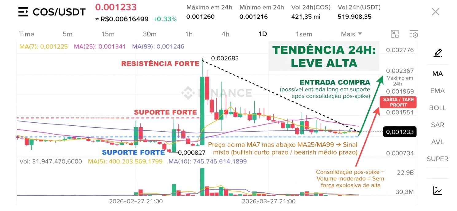 - Volume 24h está moderado (421 mi COS), sem picos de compra agressiva. Os últimos candles mostram corpos pequenos com mistura de verdes e vermelhos, indicando indecisão + falta de convicção dos compradores após o dump do spike.