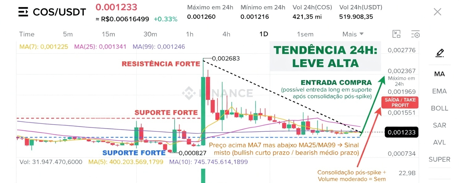 - Entrada: Agora ou em qualquer pullback que segure a zona 0,001216–0,001233 (suporte atual da MA7). Confirme com candle verde forte + volume crescente.