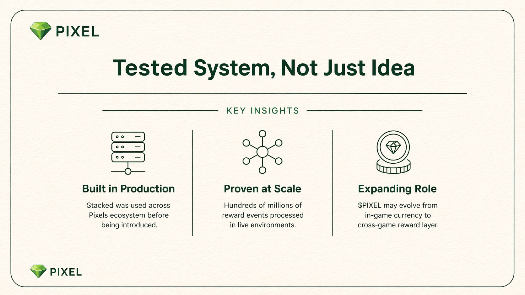 Trước đây nó chỉ là currency trong game, dùng cho mấy hoạt động “premium” như mint NFT, boost, tham gia guild. Nhưng nếu Stacked mở ra cho nhiều studio khác, thì PIXEL thể không còn chỉ gắn với một game nữa. Nó có thể trở thành một dạng reward hoặc loyalty token dùng xuyên nhiều game trong cùng hệ thống.
