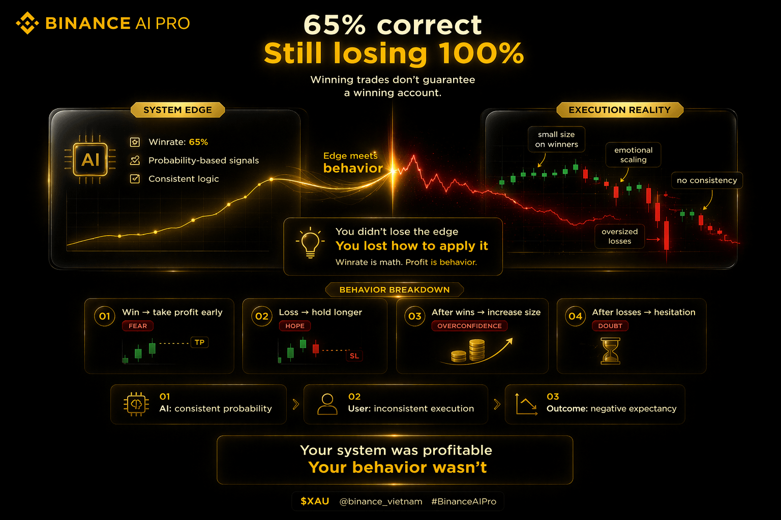 Binance AI Pro hoạt động dựa trên xác suất. Nó cho mình một edge nhất định. Nhưng cái account của mình thì lại bị chi phối bởi cảm xúc. Hai thứ này không tự nhiên align với nhau. Nếu mình không kiểm soát được position size, không giữ được risk/reward hợp lý, và không tuân thủ stop-loss, thì chính mình sẽ làm mất đi cái edge đó.
