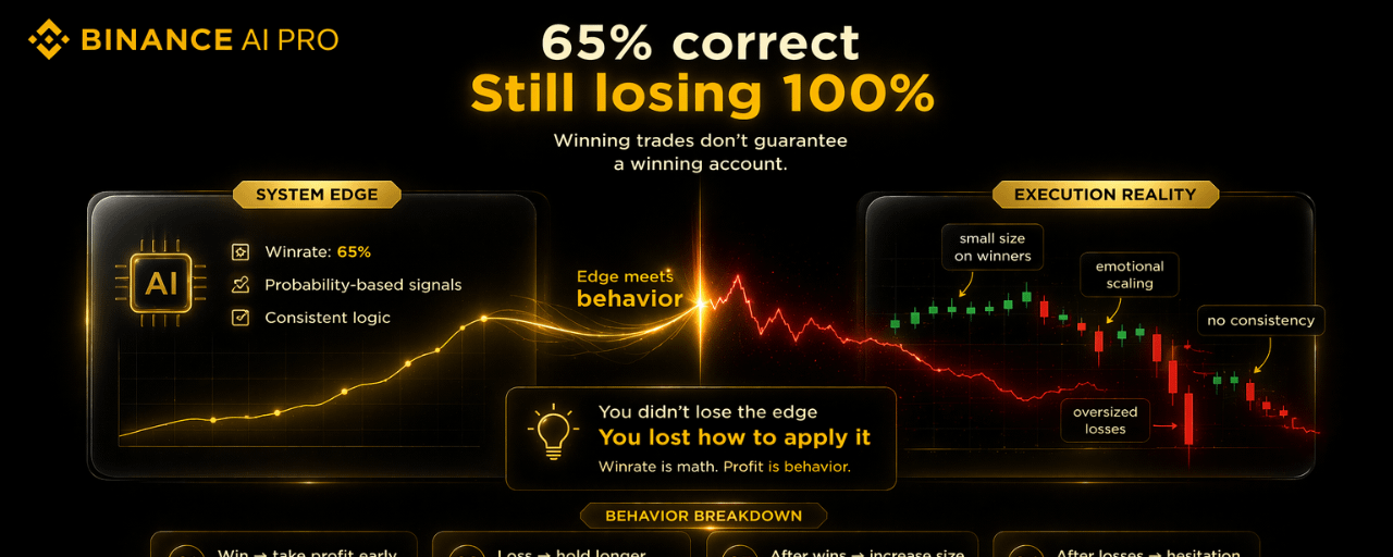 Nghe thì hơi vô lý, nhưng mình đã từng rơi đúng vào trạng thái này khi bắt đầu dùng Binance AI Pro. Lúc đó mình khá tự tin, vì nhìn tín hiệu thấy ổn, winrate có vẻ tốt. Trong đầu mình nghĩ rất đơn giản: chỉ cần AI đúng nhiều hơn sai, kiểu gì tài khoản cũng tăng.