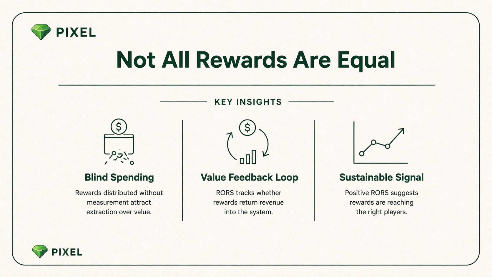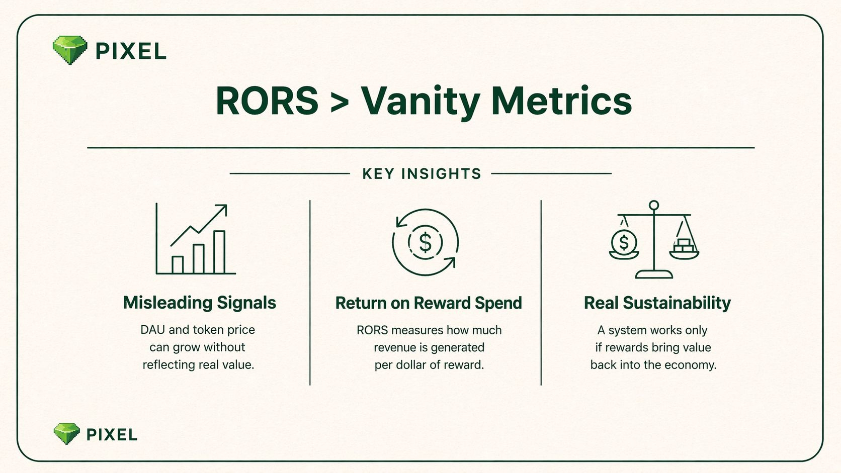 Mình đọc về Pixels gần đây và có một chi tiết nhỏ nhưng cứ bị ám lại. Họ không nói nhiều về DAU, cũng không khoe giá token. Thứ họ nhắc tới lại là một metric tự đặt tên: RORS, Return on Reward Spend.