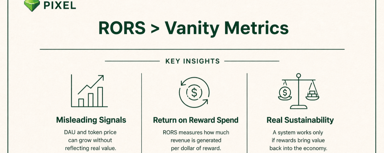 Nó chỉ đơn giản là: mỗi 1 đô reward bỏ ra thì mang về bao nhiêu doanh thu trong game. Không phải token price, không phải volume, mà là tiền người chơi thực sự chi — mua item, subscription, fee marketplace. Nếu bỏ ra 100k mà chỉ thu về 70k thì RORS là 0.7, nghĩa là đang lỗ, dù bên ngoài nhìn token vẫn có thể đang tăng.