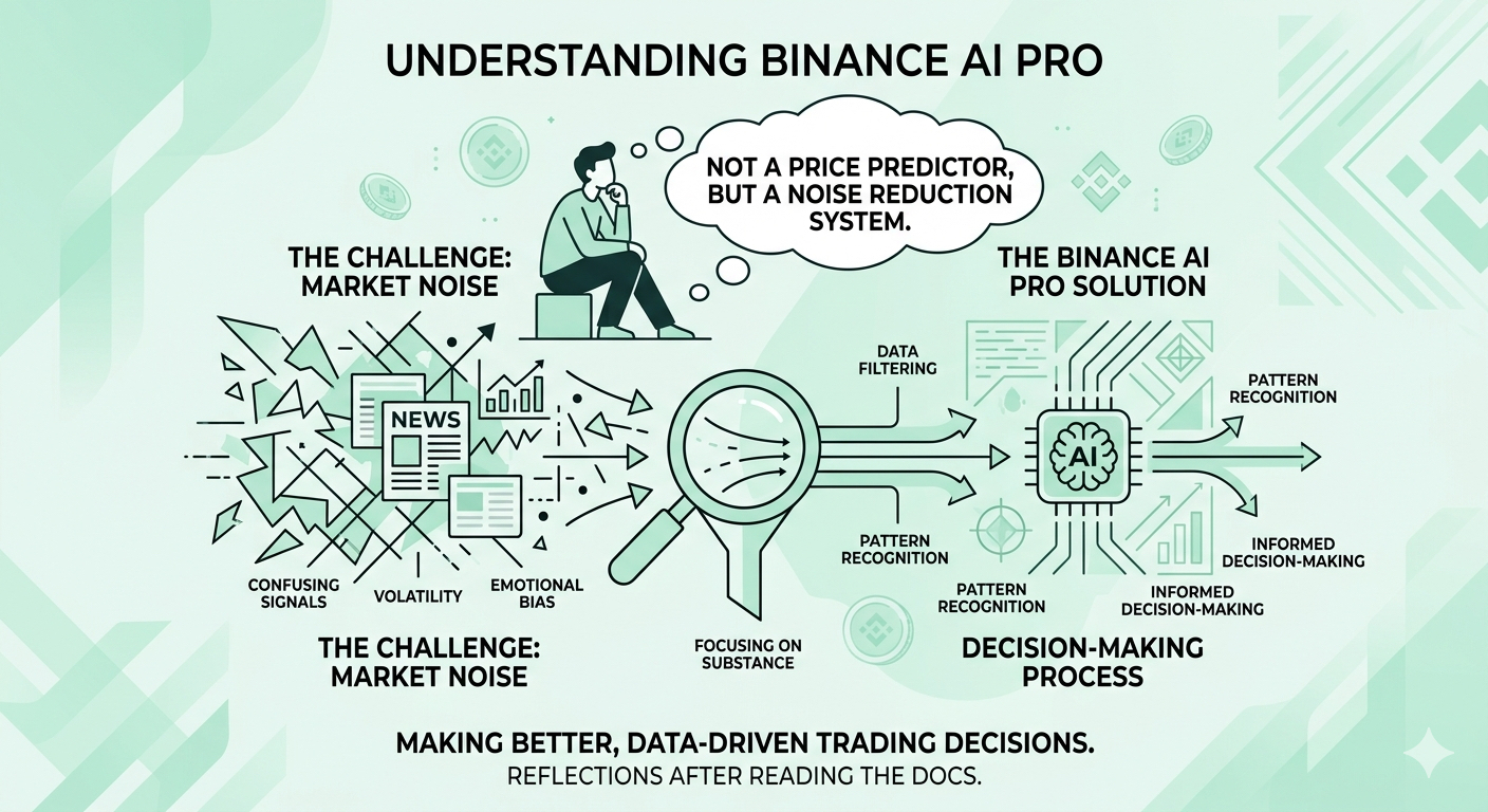 Tôi đã dành khá nhiều thời gian để nghĩ về điều này. đặc biệt là sau khi tôi bắt đầu đọc docs của Binance AI Pro và cố gắng hiểu cách nó vận hành. Điều tôi thấy thú vị là nó không được xây dựng như một công cụ “predict price” mà giống như một system giúp giảm noise trong decision.