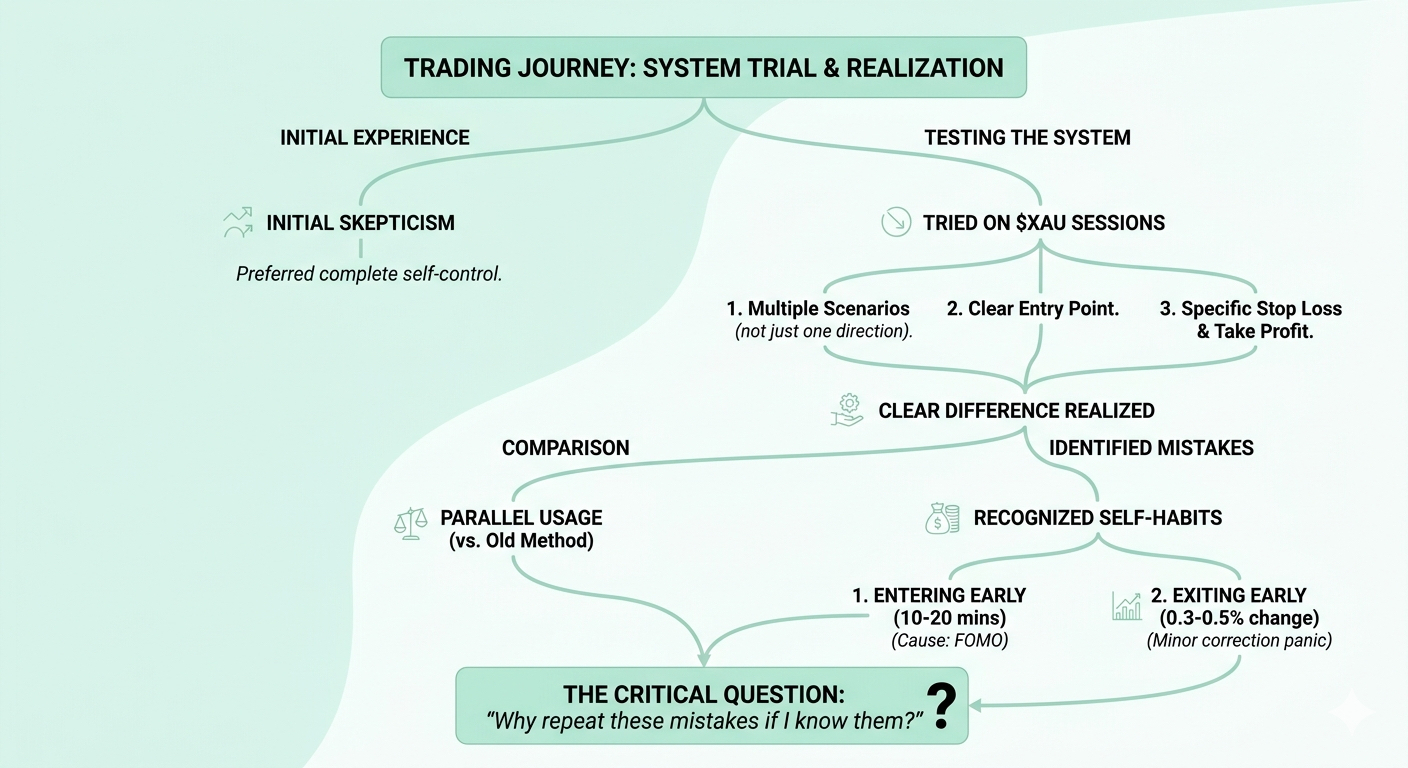 Tôi nhận thấy rằng vấn đề của tôi không nằm ở việc tôi không biết analysis. mà nằm ở việc tôi không giữ được consistency trong hành động của chính mình. Và khi đặt điều này cạnh một system không có emotion tôi bắt đầu phân biệt rõ hơn giữa hiểu market và chịu đựng market.