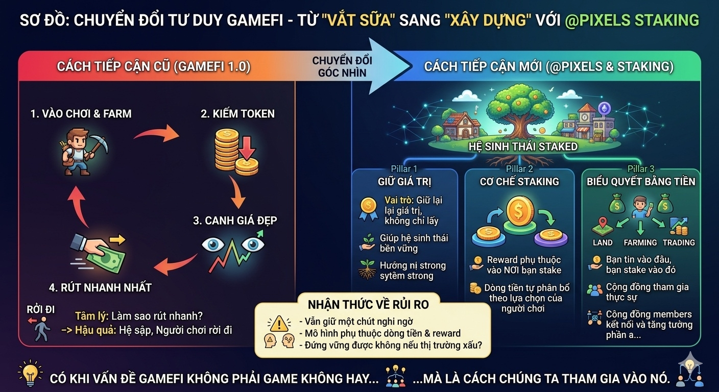 Nhưng khi mình đọc kỹ hơn về hệ Staked của Pixels, mình phải dừng lại suy nghĩ một chút. Theo cách mình hiểu, staking ở đây không chỉ là để “ăn lãi”, mà giống như mình đang chọn đứng về phía nào trong hệ sinh thái. Kiểu như mình không còn là người chỉ vào game để lấy giá trị nữa, mà bắt đầu có vai trò giữ lại giá trị đó.