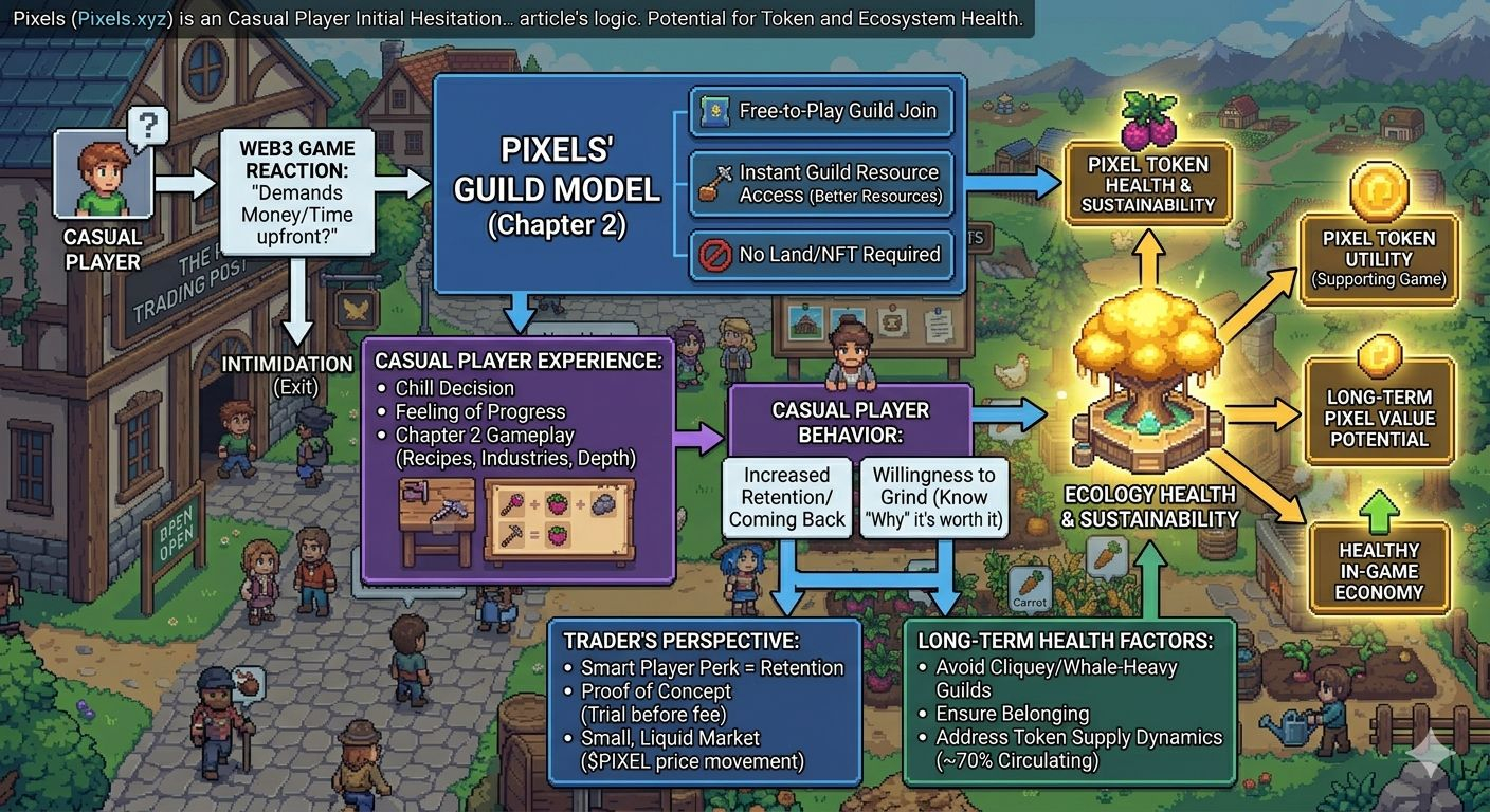 From a trader’s perspective, this isn’t just some nice little player perk. It’s actually smart. Most GameFi stuff loses people the second it starts demanding commitment before they’ve even gotten hooked. Pixels seems to get that. Let a casual player hop in, join a guild, mess with cooler stuff, and actually feel like they’re moving forward? It’s like letting someone try out the good weights at the gym before you hit them with the yearly fee. They still gotta show up, but at least they know why it might be worth it.