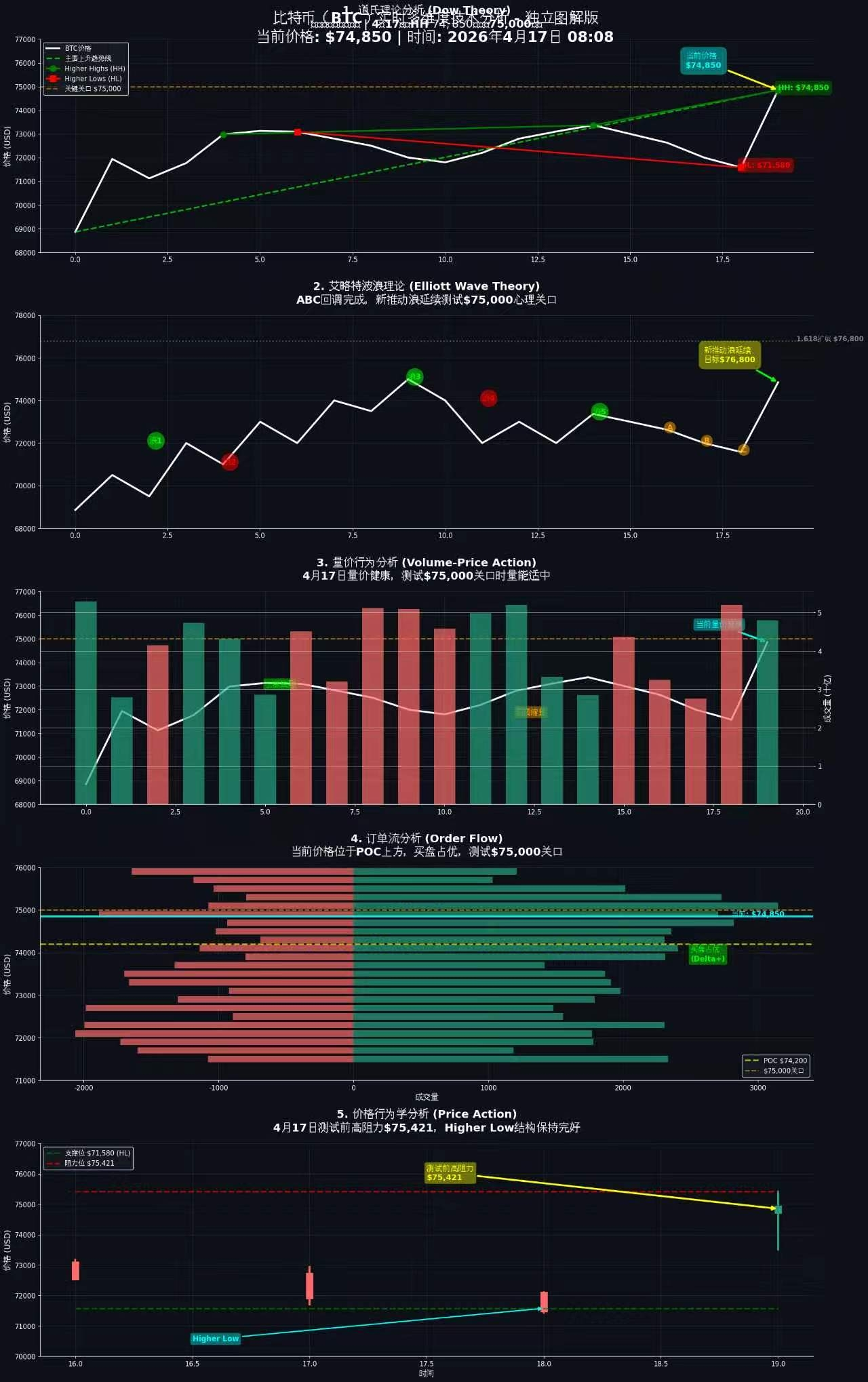⚠️ 风险提示: 4月17日比特币价格$74,850,测试$75,000-$75,421前高阻力区域。当前需关注能否有效突破,若失败回落可能测试$74,200支撑。建议仓位控制在2-3倍杠杆,严格设置止损。
