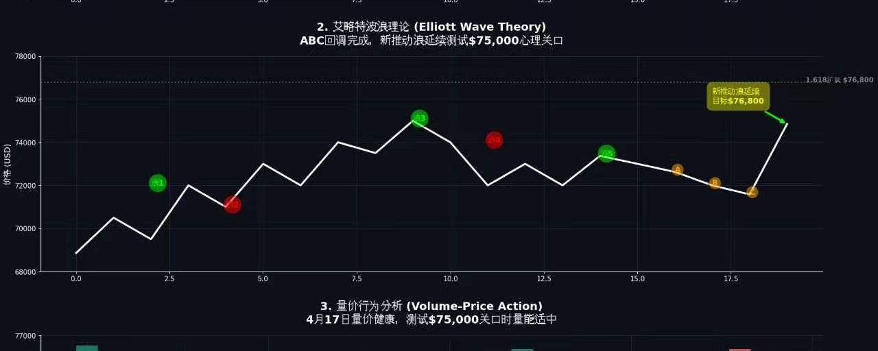当前信号: ABC回调完成,新推动浪延续测试$75,000心理关口,目标1.618扩展位$76,800