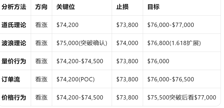 当前信号: 当前价格位于POC $74,200上方,买盘占优,测试$75,000关口