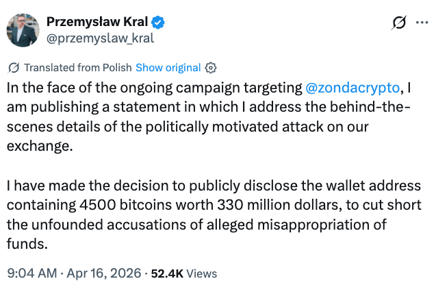 Giám đốc điều hành Zonda, Przemysław Kral, đã đăng một tuyên bố bằng video vào thứ Năm để tiết lộ địa chỉ ví của sàn giao dịch, đồng thời cho biết các khóa riêng tư của ví này chưa bao giờ được bàn giao.