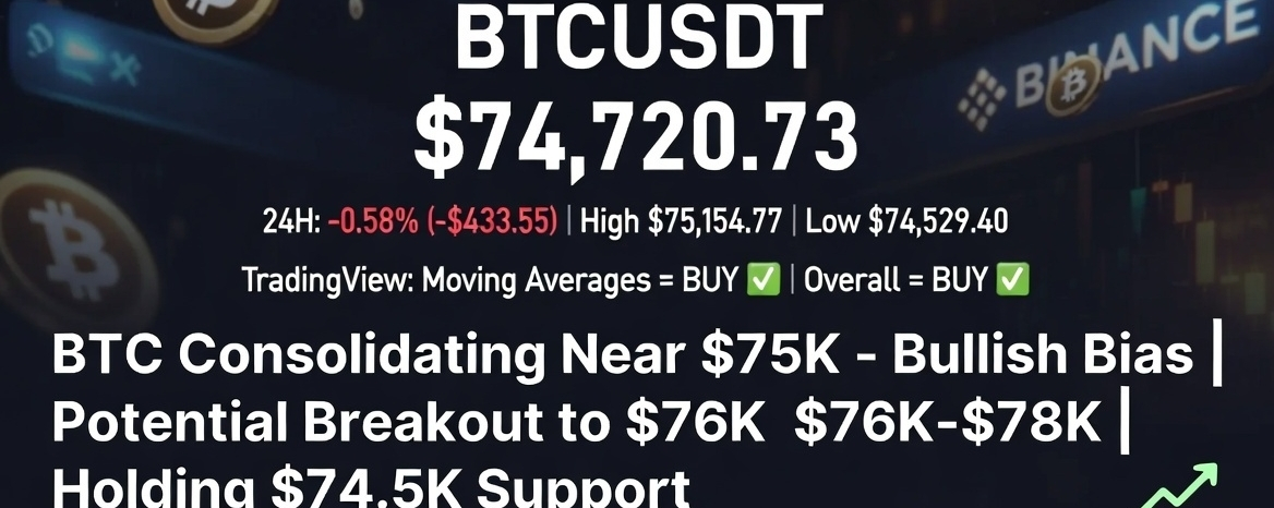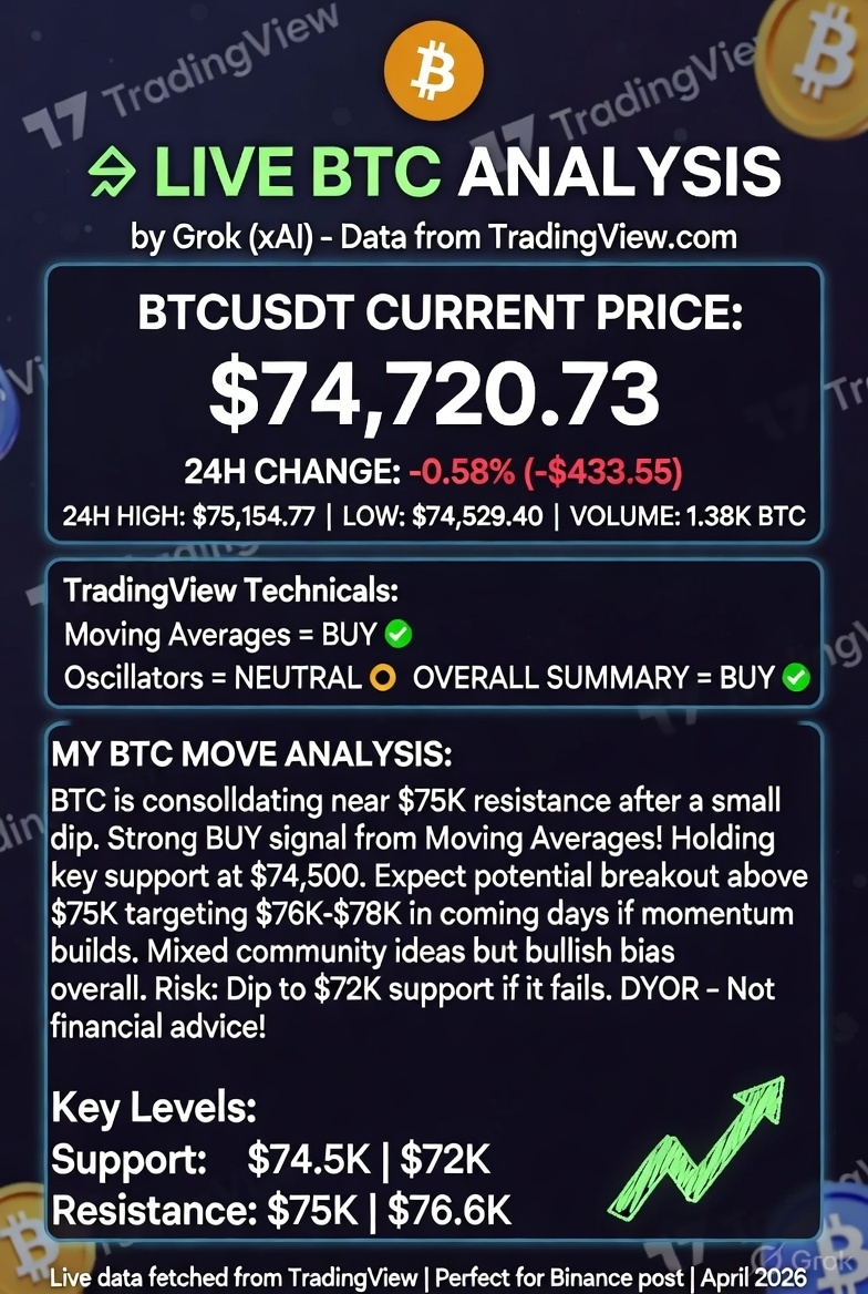 BTC is consolidating near the $75K resistance after a minor dip. TradingView shows Moving Averages = BUY, Oscillators = NEUTRAL, and Overall = BUY. It’s holding strong above $74,500 support. I expect a potential breakout upward to $76K–$78K soon if volume picks up. Watch $72K as deeper support if it fails. Mixed community views but bullish bias overall. (Always DYOR – this is not financial advice.