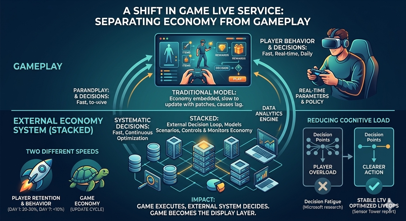 Trước đây, economy luôn nằm trong game. drop rate, reward curve, pricing, event logic đều được nhúng trực tiếp vào hệ thống. mỗi thay đổi đều phải đi qua một chu kỳ release. trong khi đó, dữ liệu người chơi thì chạy theo thời gian thực.