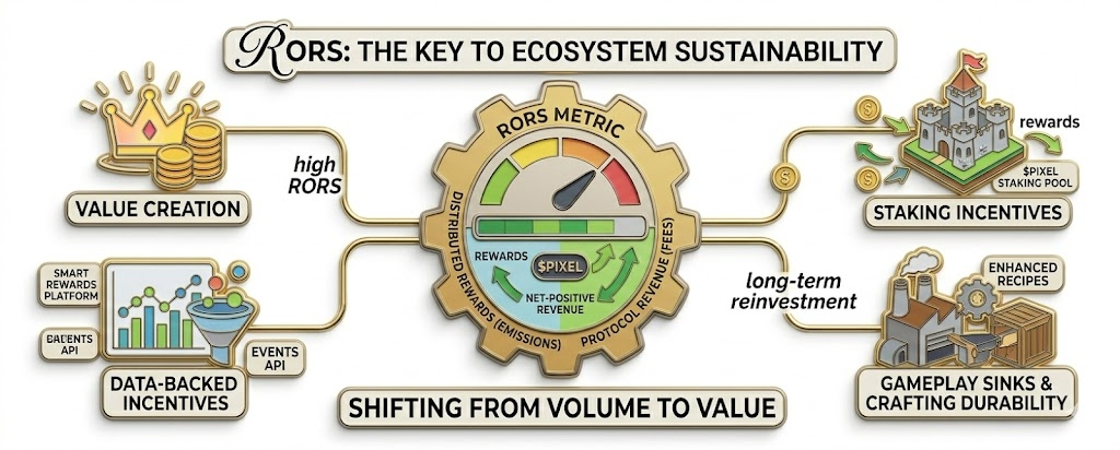 In the end, I think RORS could become the most important metric in the Pixels ecosystem because it brings everything back to one honest question: are rewards truly building value, or are they just being spent? That question matters more than hype, more than raw DAU, and more than short-term token excitement. Pixels already learned that fast growth alone does not guarantee a healthy system. Now it is trying to build a model where staking, spending, gameplay, data, and publishing all work toward stronger reward efficiency. For me, that is why RORS stands out so much. It is simple enough to understand, but deep enough to reflect the real health of the ecosystem. And honestly, if Pixels can keep pushing that number from 0.8 to above 1.0, then it will not just be improving a metric. It will be proving that its whole model is starting to work the way it was meant to.