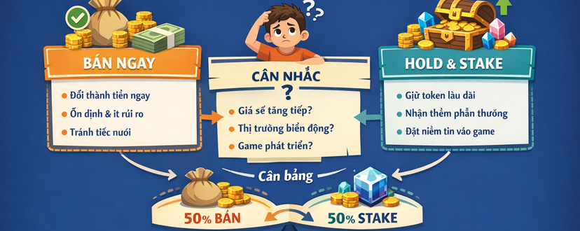 Sau đó mình đọc thêm về cách vận hành của game và token, mình mới hiểu là không nhất thiết phải chọn một trong hai. Mình bắt đầu chia ra: một phần bán để đảm bảo mình có “kết quả”, phần còn lại mình giữ hoặc đem đi stake. Lúc đầu mình tưởng stake phức tạp, nhưng tìm hiểu kỹ thì thấy nó giống như cách để mình vừa giữ token, vừa nhận thêm lợi ích từ việc nắm giữ. Kiểu như mình không chỉ “ngồi chờ giá”, mà còn có thêm chút động lực để kiên nhẫn hơn.