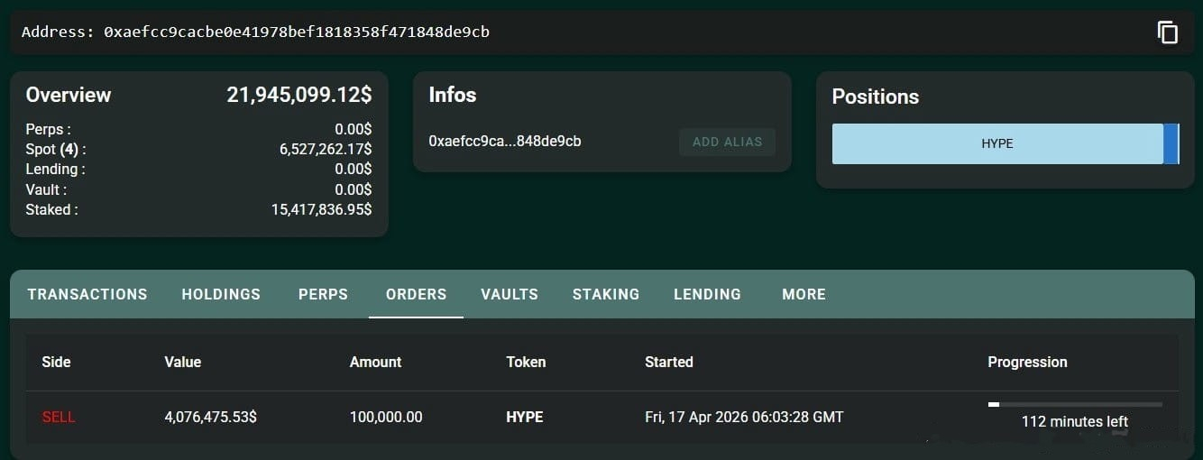 خلال الساعات الأخيرة، لفت أحد كبار حاملي عملة HYPE منذ مرحلة الـ Genesis الأنظار بتحرّك محسوب بدقة. الحوت قام بفكّ رهن 150,000 توكن، بقيمة تقارب 6.5 مليون دولار، ثم وضع أمر بيع تدريجي (TWAP) لتصريف 100,000 توكن بقيمة تقارب 4.3 مليون دولار. هذه ليست عملية بيع عشوائية، بل تنفيذ احترافي يهدف لتفادي الضغط الحاد على السعر.
