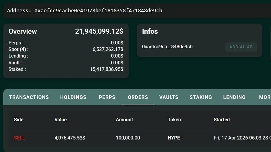 فالحوت لا يزال يحتفظ بـ 354,303 توكن HYPE (أكثر من 15 مليون دولار) في حالة Staking، وهو ما يفتح بابًا لتحليل أعمق من مجرد “باع أو لم يبع”.