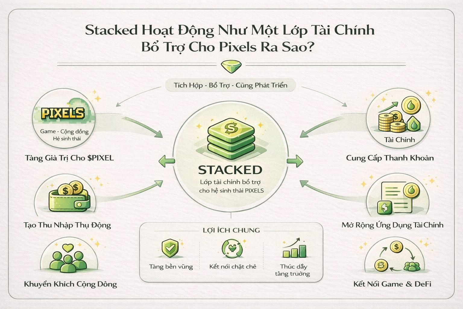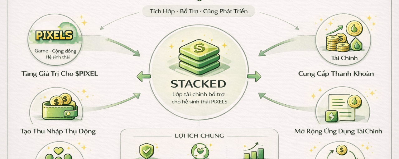 Tối nay mình ngồi nối lại câu chuyện giữa $PIXEL và Stacked, và càng nghĩ mình càng thấy nếu phải mô tả ngắn gọn thì Stacked giống một lớp tài chính bổ trợ đứng phía sau Pixels hơn là một sản phẩm tách rời.