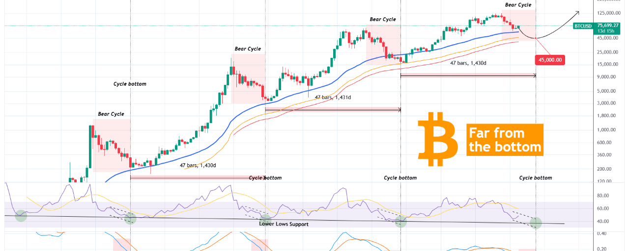Ngoài ra, kể từ đáy tháng 1 năm 2015, mỗi đáy của Chu Kỳ Gấu đều có giá 1430 ngày (47 tuần) sau đáy trước đó. Nếu điều đó lại đúng, Chu Kỳ sẽ không đáy trước tháng 10 năm 2026. Hơn nữa, giá đang lơ lửng chỉ trên đường trung bình 1M MA50 (đường xu hướng màu xanh), đã bị phá vỡ trong Chu Kỳ Gấu cuối cùng, với BTC đáy trên 1W MA350 (đường xu hướng màu cam). Về mặt kỹ thuật, lần này nó có thể giảm xuống thấp hơn cả 1M MA100 (đường xu hướng màu đỏ), vì vậy hai mức này cho chúng ta một vùng Đáy (Mua) ước tính từ $50000 - 40000.