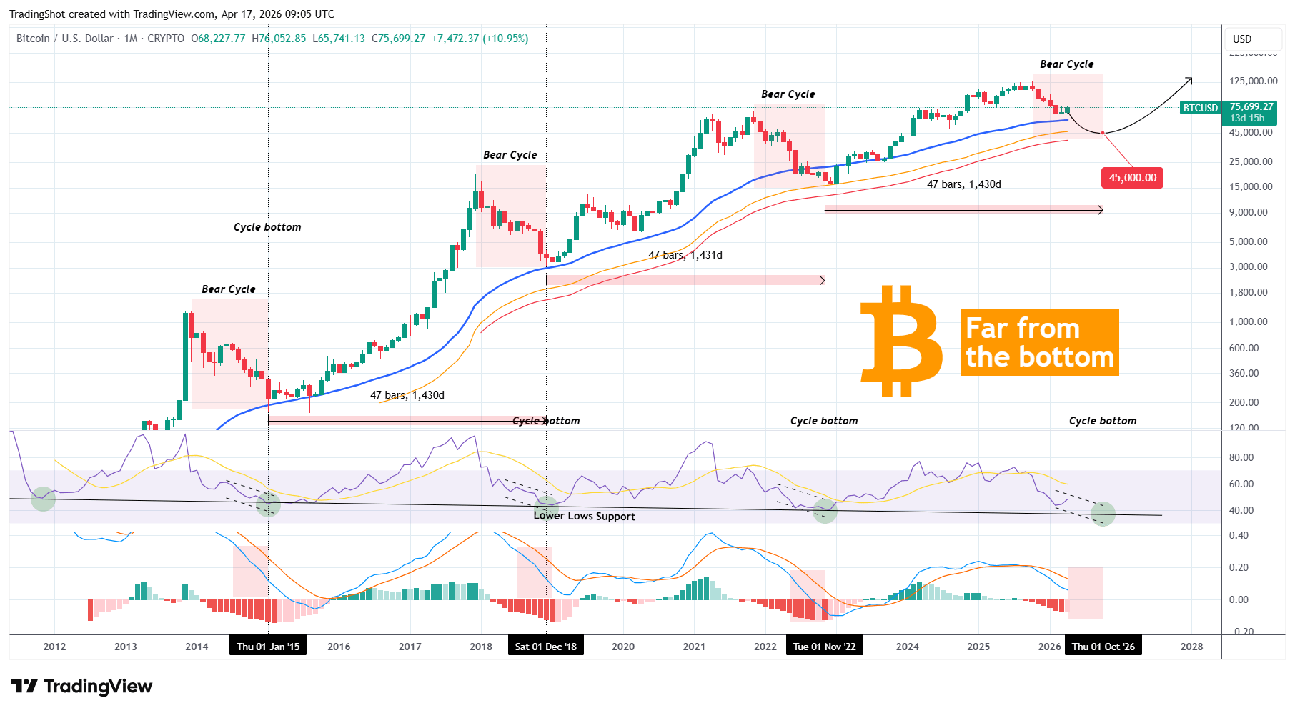Ngoài ra, chỉ số 1M LMACD vẫn cao, không có dấu hiệu tạo ra một giao cắt Tăng, mặc dù thanh histogram tháng 4 của nó đã chuyển sang màu đỏ nhạt. Điều này vẫn còn thời gian để thay đổi trước khi kết thúc tháng, nhưng ngay cả khi nó giữ nguyên như vậy, đây sẽ không phải là lần đầu tiên có một thanh màu đỏ nhạt trước đáy của Chu Kỳ (đã xảy ra vào tháng 10 năm 2022).