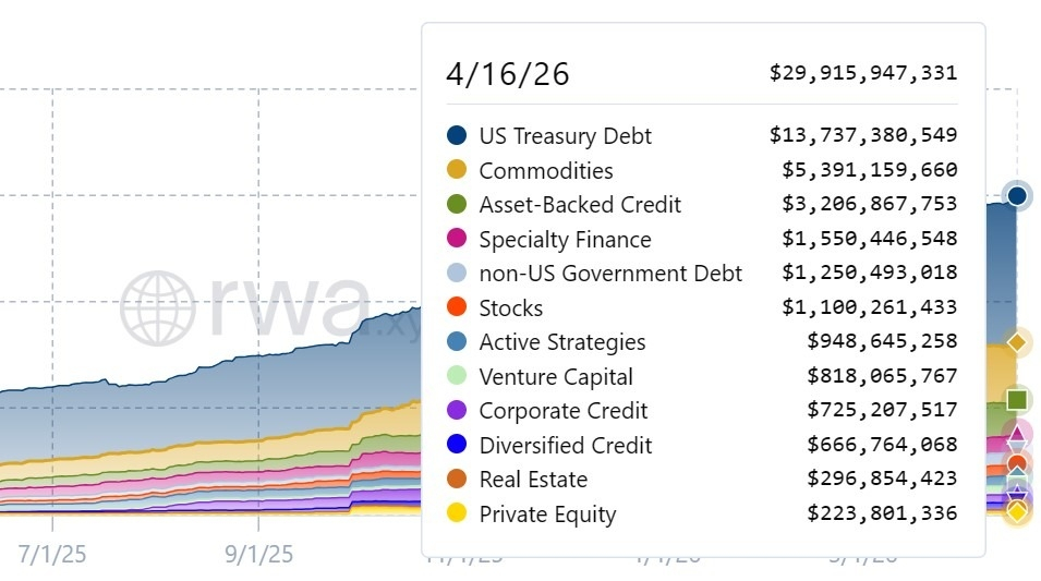 Dữ liệu từ nền tảng phân tích RWA RWA.xyz cho thấy thị trường RWA được mã hóa đã mở rộng từ 8.8 tỷ USD vào ngày 16 tháng 4 năm 2025 lên khoảng 29.9 tỷ USD vào ngày 16 tháng 4 năm 2026, tăng hơn ba lần về quy mô trong một năm.