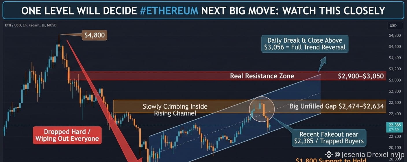 Một Cấp Độ Sẽ Quyết Định Di Chuyển Lớn Tiếp Theo Của #ETHEREUM: Theo Dõi Kỹ Cái Này$ETH dropped hard from $4,800 all the way to $1,765, wiping out almost everyone on the way down. Đáy đó có vẻ như đã xong cho đến bây giờ. Kể từ đó, giá đã từ từ leo lên trong một kênh tăng. Gần đây, chúng ta đã thấy một cú giả mạo gần $2,385, giá đã phá vỡ lên trên kênh, bẫy người mua, và quay trở lại ngay. Di chuyển cổ điển. Hiện tại #ETH đang ngồi ngay dưới một khoảng trống lớn chưa lấp đầy giữa $2,474–$2,634. Đó là nơi giá muốn đi tiếp. Trên đó, $2,900–$3,050 là kháng cự thực sự. Nếu ETH phá vỡ và đóng cửa trên $3,056 hàng ngày, điều đó sẽ thay đổi mọi thứ. Đảo chiều xu hướng hoàn toàn. Ở phía dưới, $1,800 là hỗ trợ cần giữ. Nếu $1,765 bị phá vỡ, đó là rắc rối. Quan Điểm Của Tôi: ETH đang phục hồi nhưng chưa chứng minh được bản thân. Vẫn cần phải phá vỡ $3,050 để xác nhận sức mạnh thực sự. Cho đến lúc đó, hãy kiên nhẫn và để giá cho bạn thấy động thái. Không vội vàng. Theo dõi các mức. Chỉ là phân tích của tôi. Không phải lời khuyên tài chính. Luôn tự nghiên cứu.$ETH