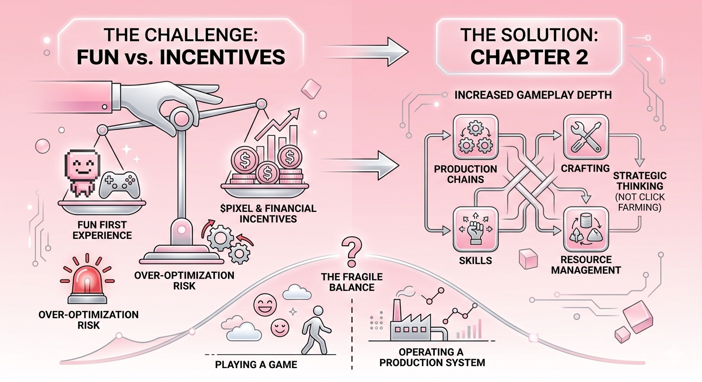 Bởi vì không dễ để giữ trải nghiệm “fun first” khi vẫn có token và incentive đi kèm. Chỉ cần còn $PIXEL và lợi ích tài chính, thì hệ thống sớm muộn cũng sẽ bị tối ưu hóa quá mức. Vậy câu hỏi thật sự là làm sao họ có thể giữ được sự cân bằng này? Đây là lúc Chapter 2 xuất hiện với production chain, crafting, skill và resource management phức tạp hơn. Hiểu đơn giản là họ sẽ tăng chiều sâu gameplay để người chơi phải suy nghĩ chiến lược, không chỉ click farm. Nghe thì khá ổn… nhưng càng thêm chiều sâu, người chơi càng có xu hướng tối ưu hóa, và ranh giới giữa “chơi game” và “vận hành một hệ thống sản xuất” thực sự rất mong manh.