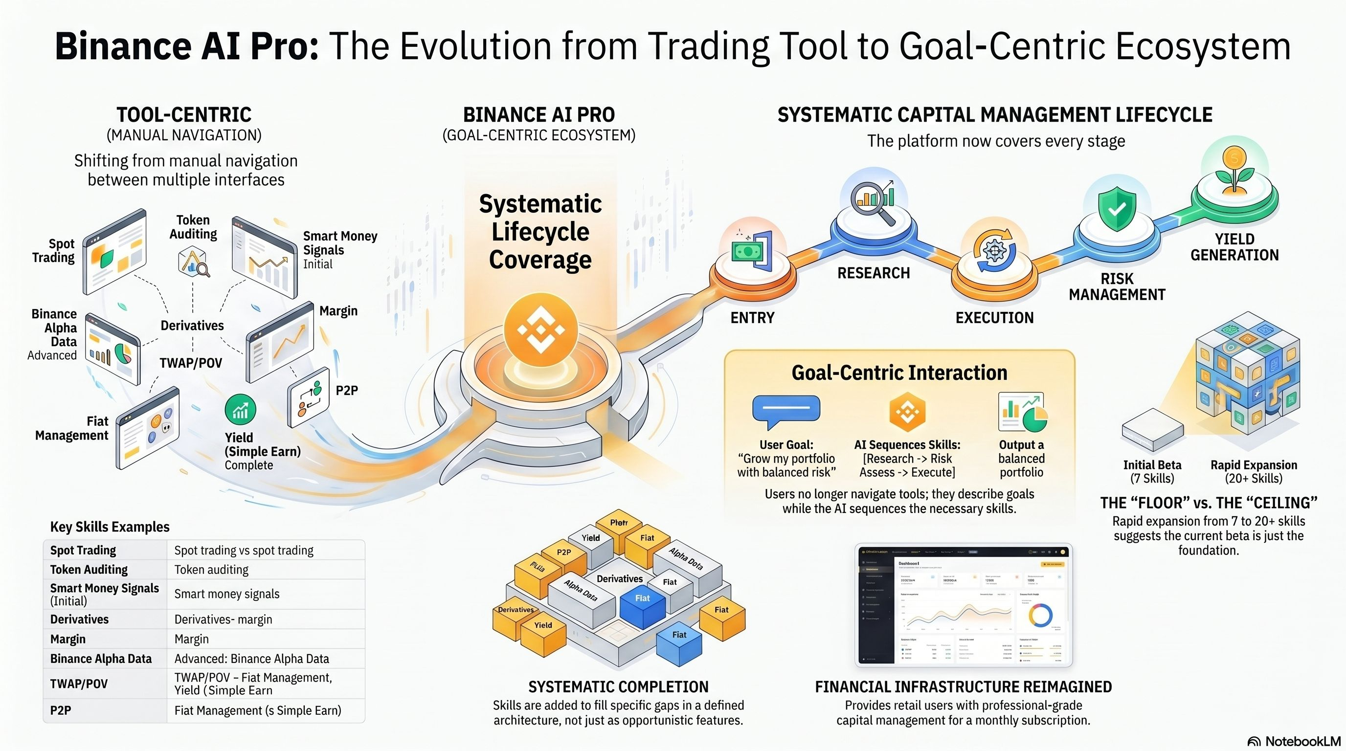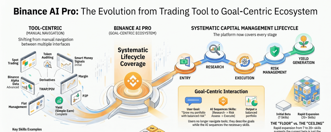và đây là nơi mà nó trở nên thực sự thú vị. một nền tảng có thể xử lý toàn bộ vòng đời quản lý vốn thông qua giao diện hội thoại không chỉ là một công cụ giao dịch. đó là một mô hình khác về cách mà các cá nhân tương tác với cơ sở hạ tầng tài chính. mô hình truyền thống yêu cầu người dùng điều hướng giữa nhiều giao diện, mỗi cái được thiết kế xoay quanh một sản phẩm cụ thể, chuyển thông tin và vốn giữa chúng một cách thủ công. mô hình Binance Ai Pro thay thế việc điều hướng đó bằng một lớp hội thoại duy nhất hiểu được mục tiêu của người dùng và lắp ráp đúng sự kết hợp của các kỹ năng để hoàn thành chúng.