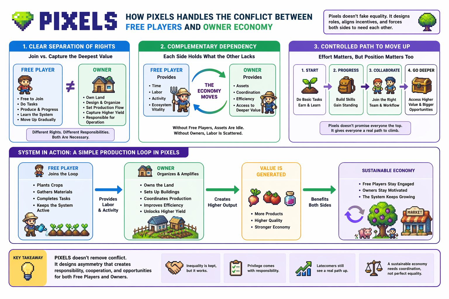 Vì điều đó, mối quan hệ giữa hai bên trong Pixels không còn là một cuộc đối đầu phẳng. Người chơi miễn phí giữ thời gian và sự sống động để giữ cho toàn bộ vòng lặp sống động. Các chủ sở hữu nắm giữ quyền sắp xếp, để tập hợp một chuỗi sản xuất, và để kéo các liên kết rải rác vào một vòng lặp với hiệu quả cao hơn. Thật nghịch lý, sự mất cân bằng này chính là điều khiến hệ thống cảm thấy ít bất công hơn so với những gì nó trông giống như. Khi đặc quyền đi kèm với trách nhiệm hoạt động, những người đến muộn có thể không thích điều đó, nhưng họ vẫn có thể thấy lý do tại sao nó tồn tại.