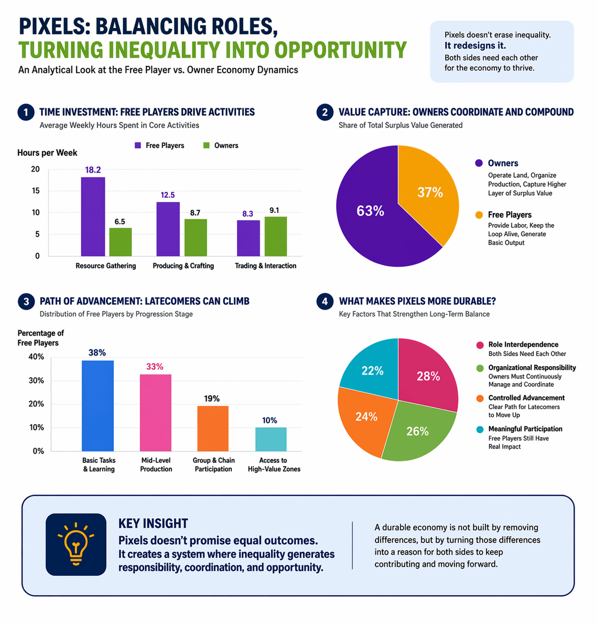 Đó là lý do tại sao tôi có một lập trường khá rõ ràng về Pixels. Dự án không giải quyết xung đột giữa người chơi miễn phí và nền kinh tế chủ sở hữu thông qua sự bình đẳng, mà bằng cách thiết kế lại sự bất đối xứng của các vai trò để cả hai bên vẫn cần nhau. Người chơi miễn phí không bị đẩy ra khỏi nền kinh tế, nhưng họ cũng không có quyền hưởng thụ lợi nhuận dày nếu họ không di chuyển vào một vị trí sâu hơn. Các chủ sở hữu không mất lợi thế của họ, nhưng để giữ lợi thế đó, họ phải tiếp tục làm việc theo cách tổ chức, thay vì chỉ ngồi yên trên tài sản.