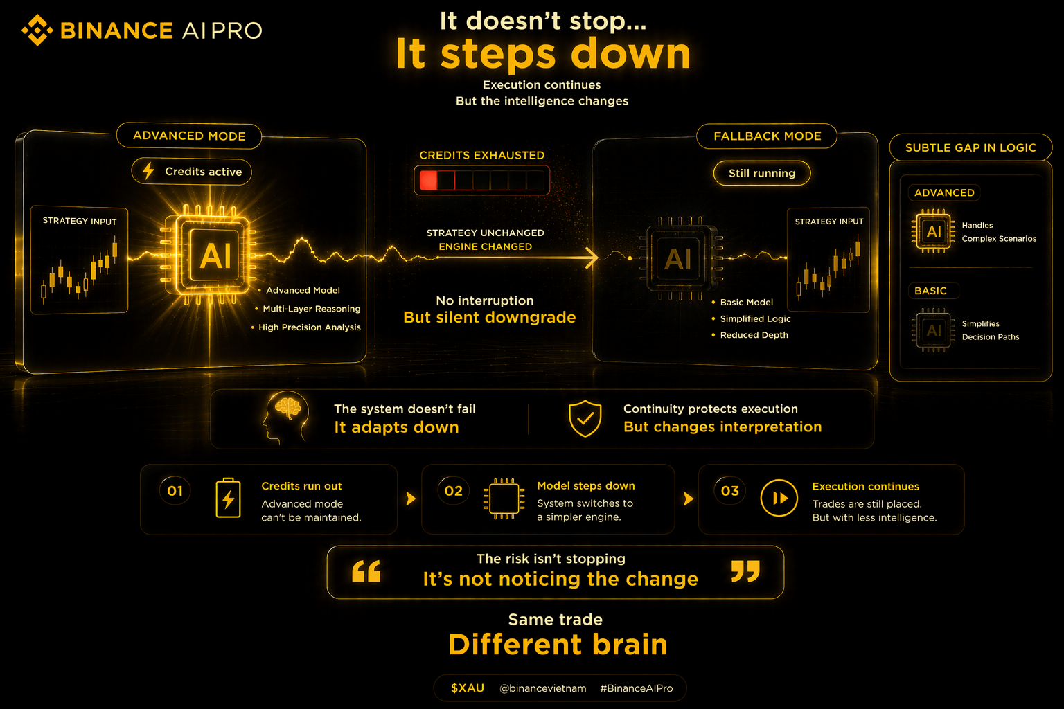 Ở góc tích cực thì điều này khá hợp lý. Nếu đang có vị thế mở mà hệ thống dừng giữa chừng chỉ vì hết credit thì còn rủi ro hơn nhiều. Việc duy trì execution liên tục quan trọng hơn việc giữ nguyên “chất lượng AI” ở mọi thời điểm.