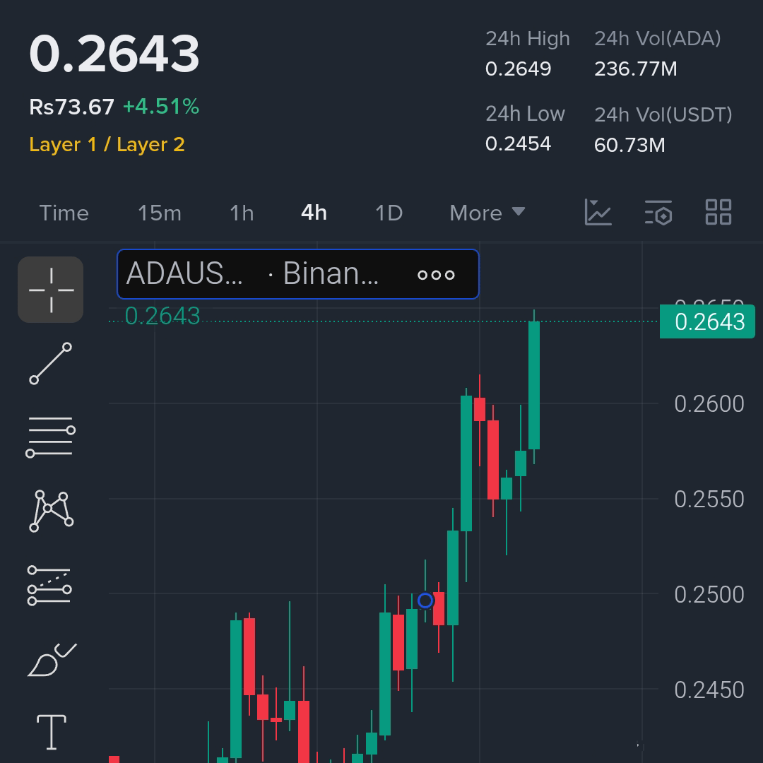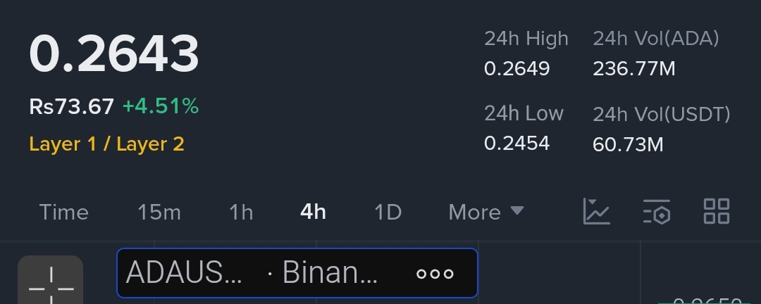 تتداول ADA حاليًا عند سعر 0.2643 دولار أمريكي، وقد شهدت ارتفاعًا بنسبة +4.51% خلال الـ 24 ساعة الماضية، مما يعكس زخمًا إيجابيًا في السوق. وقد بلغ أعلى سعر لها خلال الـ 24 ساعة الماضية 0.2649 دولارًا، بينما كان أدنى سعر 0.2454 دولارًا، مما يشير إلى تقلبات ضمن نطاق محدد قبل التحرك المحتمل.