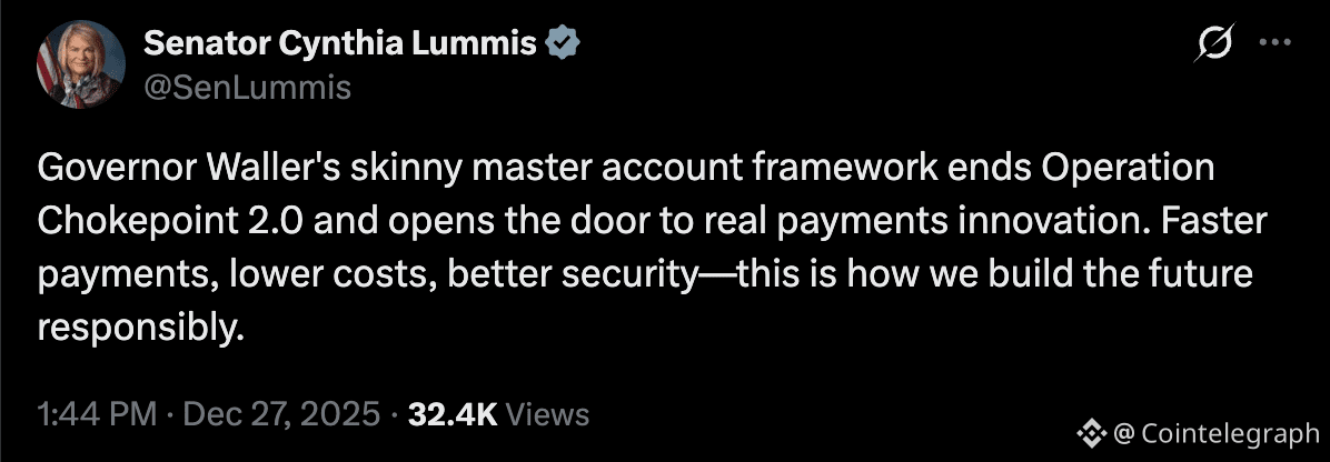 Tài khoản mục đích hạn chế của Kraken tương tự như các tài khoản chính 'gầy' của Cục Dự trữ đã được đề xuất bởi Thống đốc Cục Dự trữ Christopher Waller và được Thượng nghị sĩ Wyoming Cynthia Lummis thúc đẩy vào năm 2025.