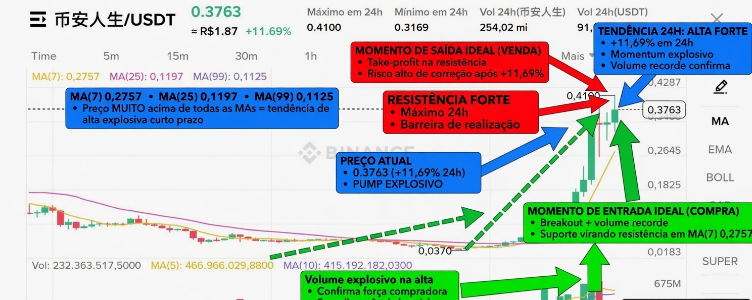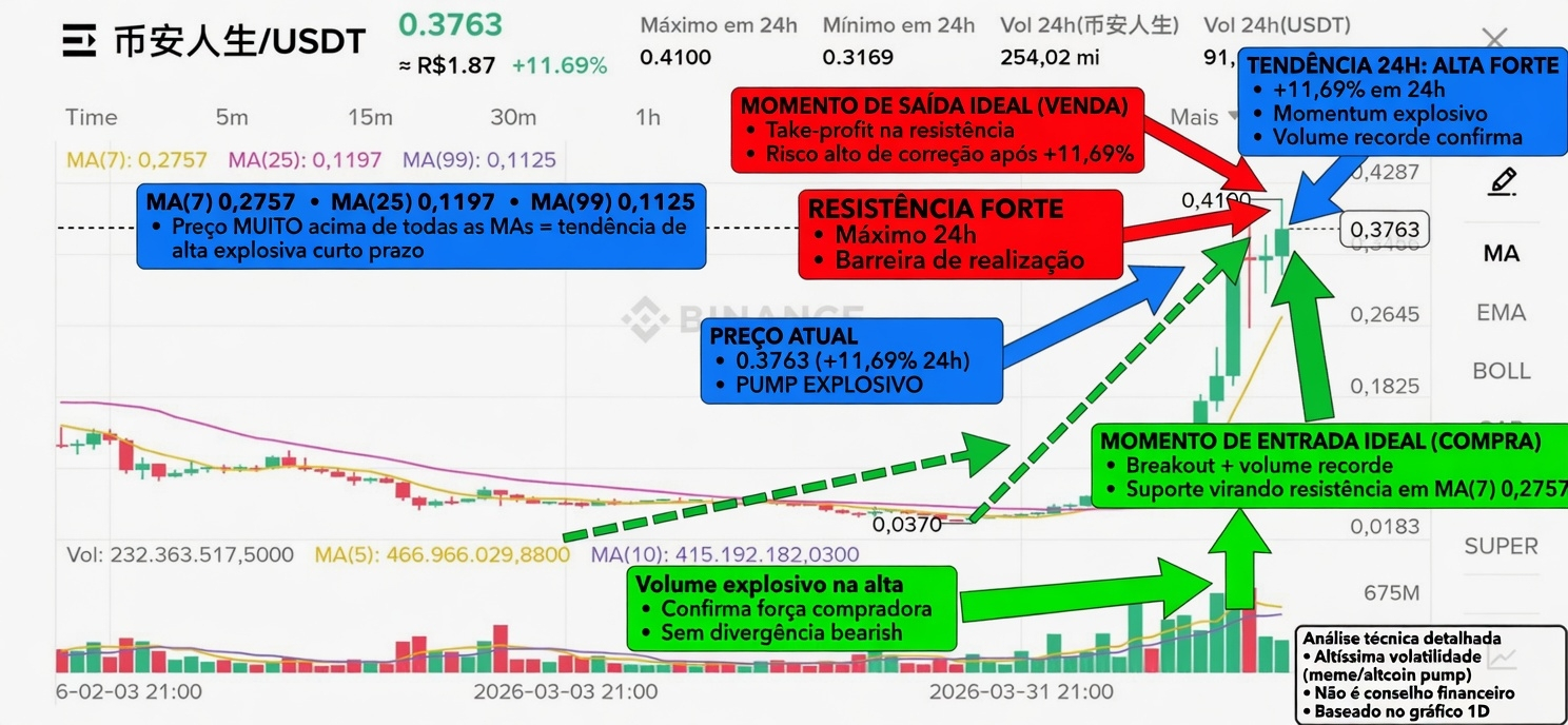 Biểu đồ cho thấy cặp 币安人生/USDT (có thể là một token meme hoặc dự án liên quan đến Binance) trong khung thời gian 1D. Giá hiện tại: US$ 0.3763 (+11,69% trong 24h qua — chuyển động cực kỳ mạnh mẽ). Cao nhất 24h: 0.4100 | Thấp nhất 24h: 0.3169. Khối lượng: 254,02 triệu token (bùng nổ).