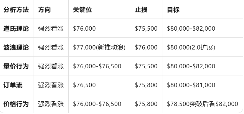 短线判断: ABC回调完成,当前处于新推动浪强势运行中,突破$78,000后目标$80,000,回调至$76,000-$76,500可加仓