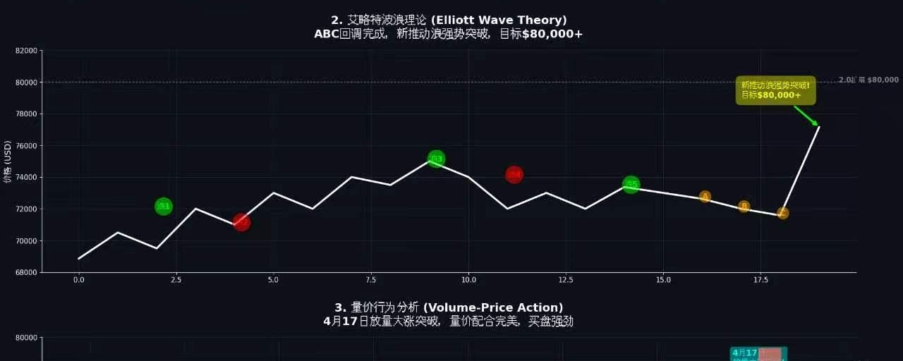 短线判断: 主要趋势进入加速阶段,4月17日大涨突破$78,000确认多头强劲,守住$76,000则趋势延续,目标$80,000-$82,000