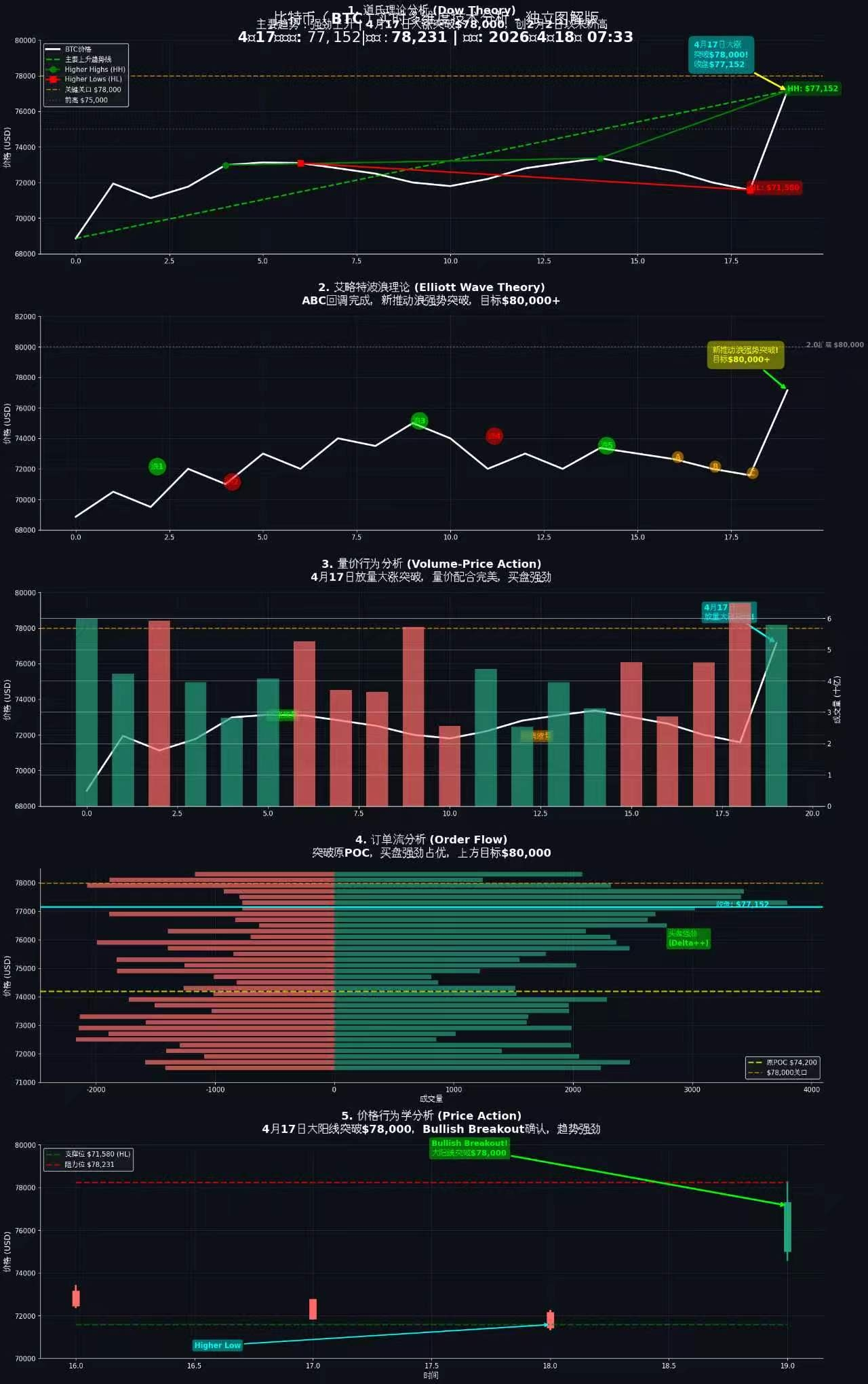 短线判断: 4月17日大阳线突破$78,000,Bullish Breakout确认,趋势强劲,等待回踩$76,000-$76,500支撑区做多,或突破$78,500后追多,止损设于$75,800下方