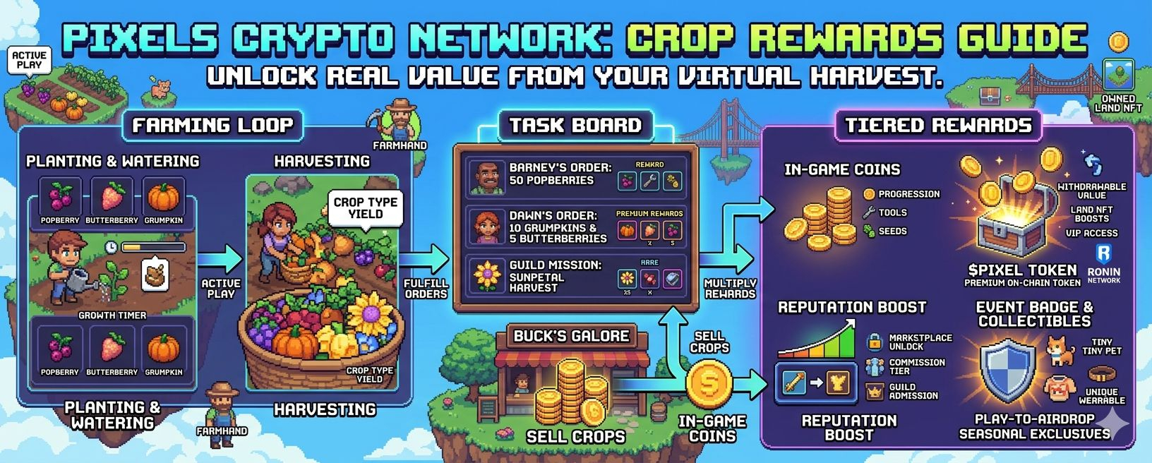 You glance at your character, outfitted in some rare skin you earned after a grueling harvest, and you feel proud. You did this. You grew the network, fed the economy, and put your mark on the Pixels world.