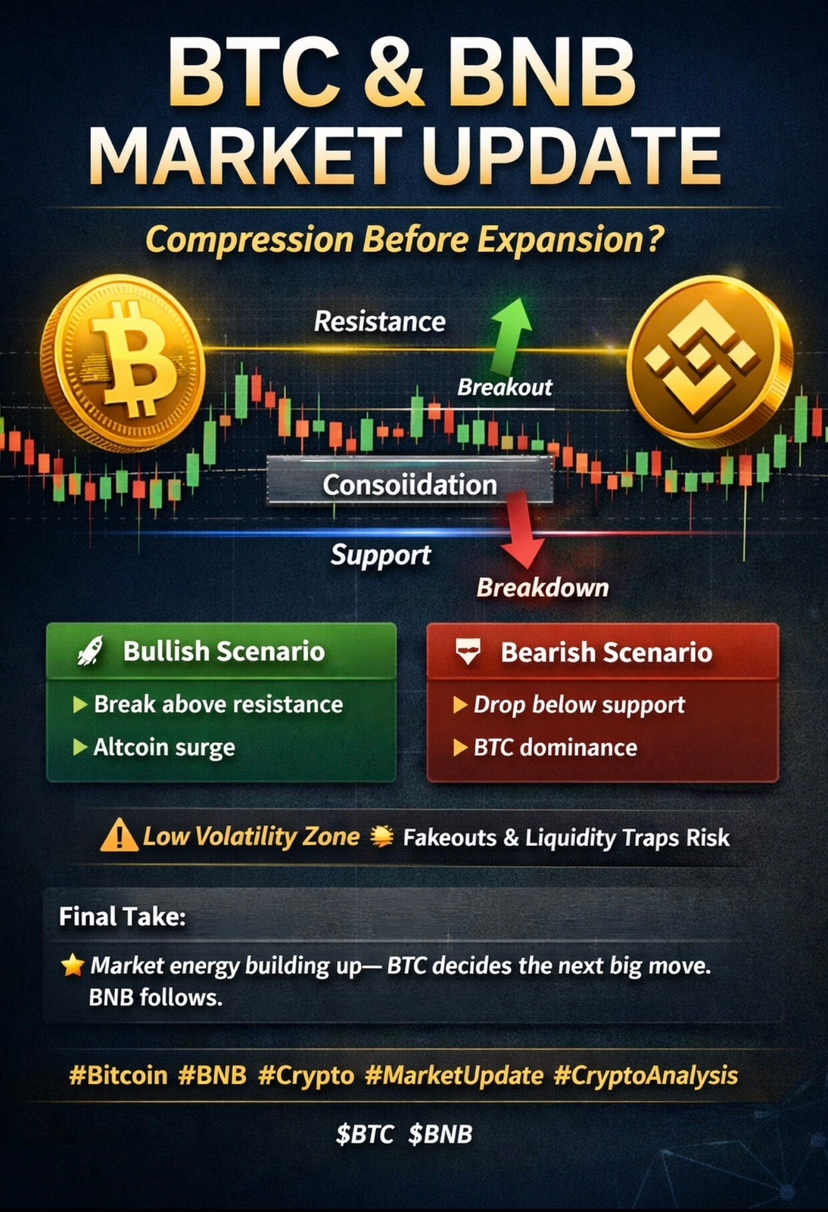 The market is currently building energy, not trend. BTC will decide direction first, and BNB will follow relative strength behavior depending on breakout confirmation.