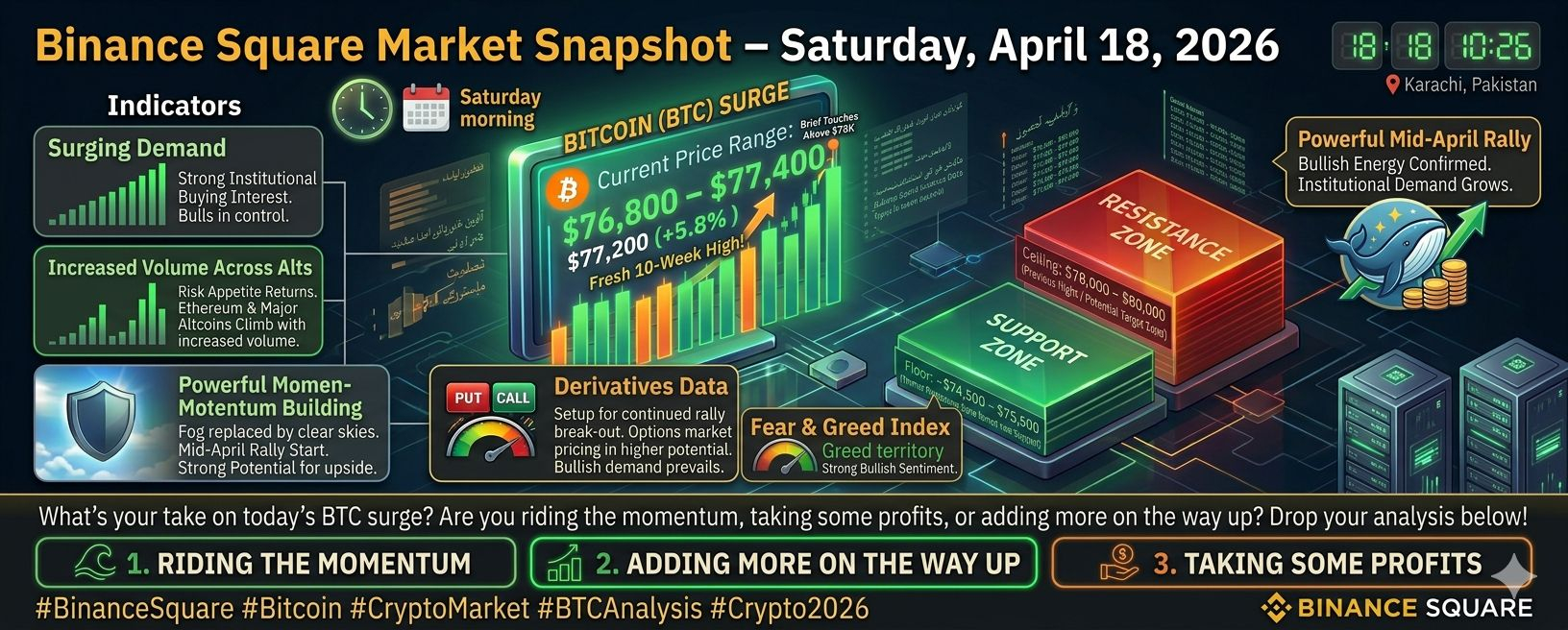 $BTC is on fire today, trading around $76,800 – $77,400 with solid gains and brief touches above $78K — marking a fresh 10-week high!