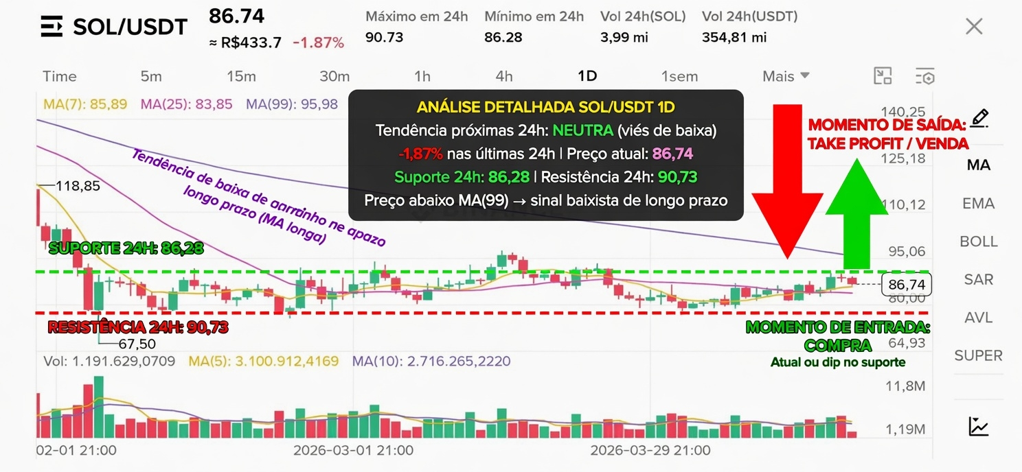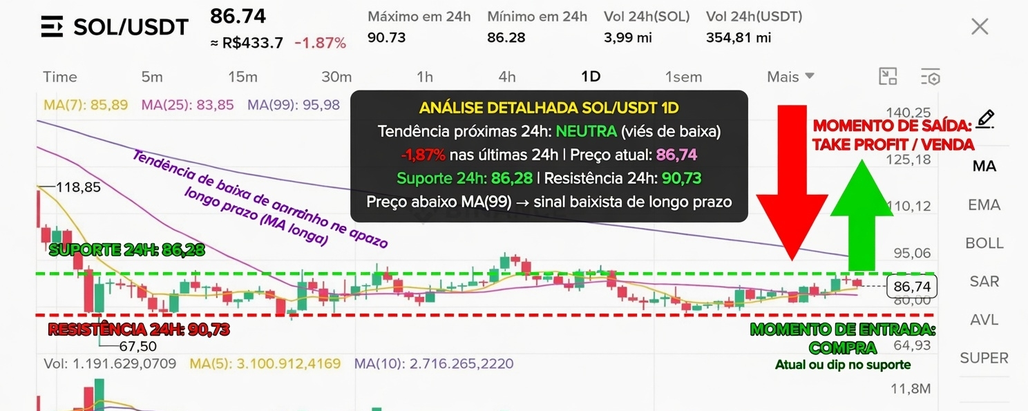 - Situação atual: Preço em 86,74 USDT (-1,87% nas últimas 24h).