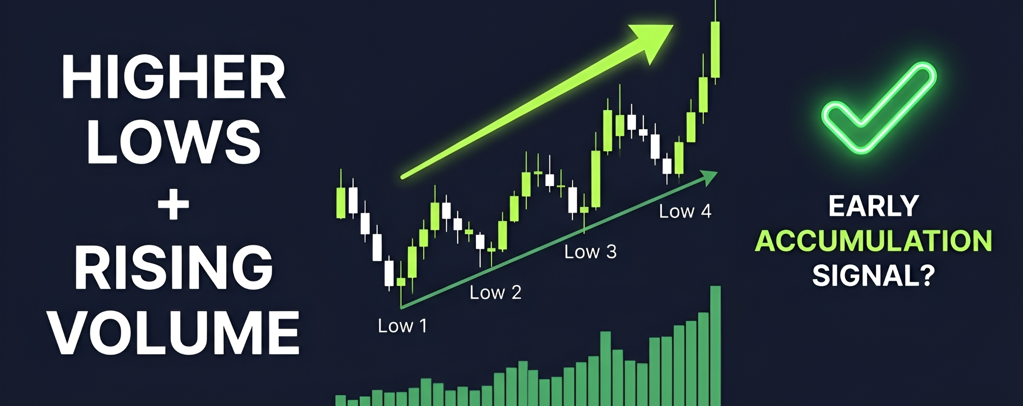The pattern of higher lows combined with a slight volume increase is one of the most discussed early accumulation signals in technical analysis. But context is everything.